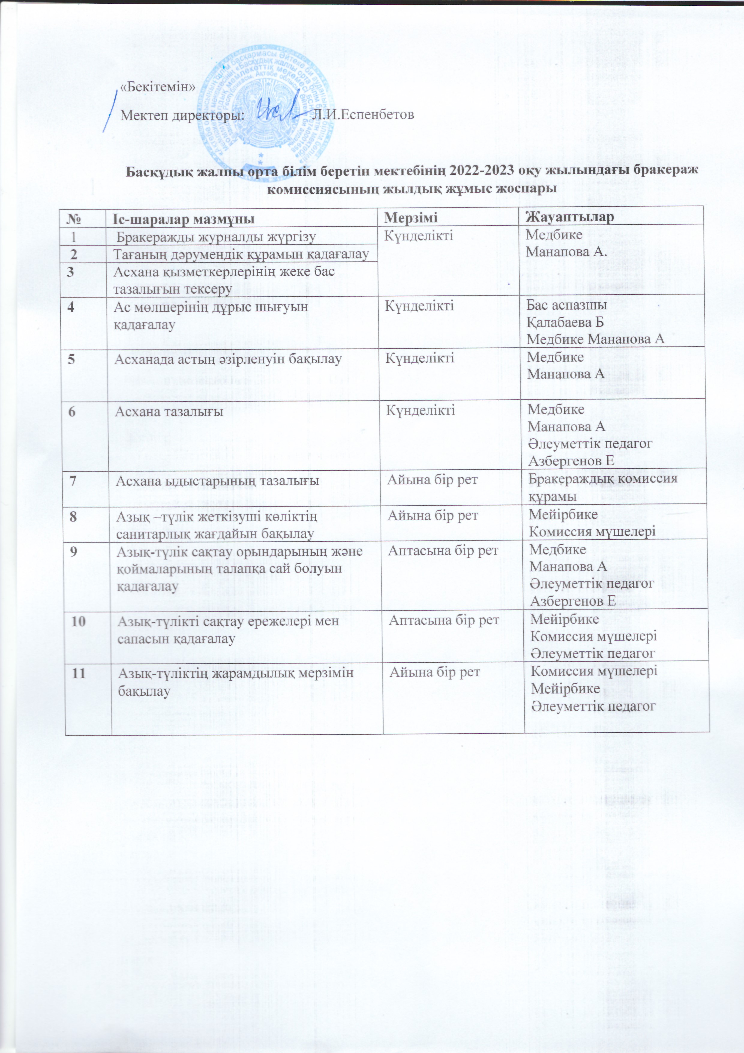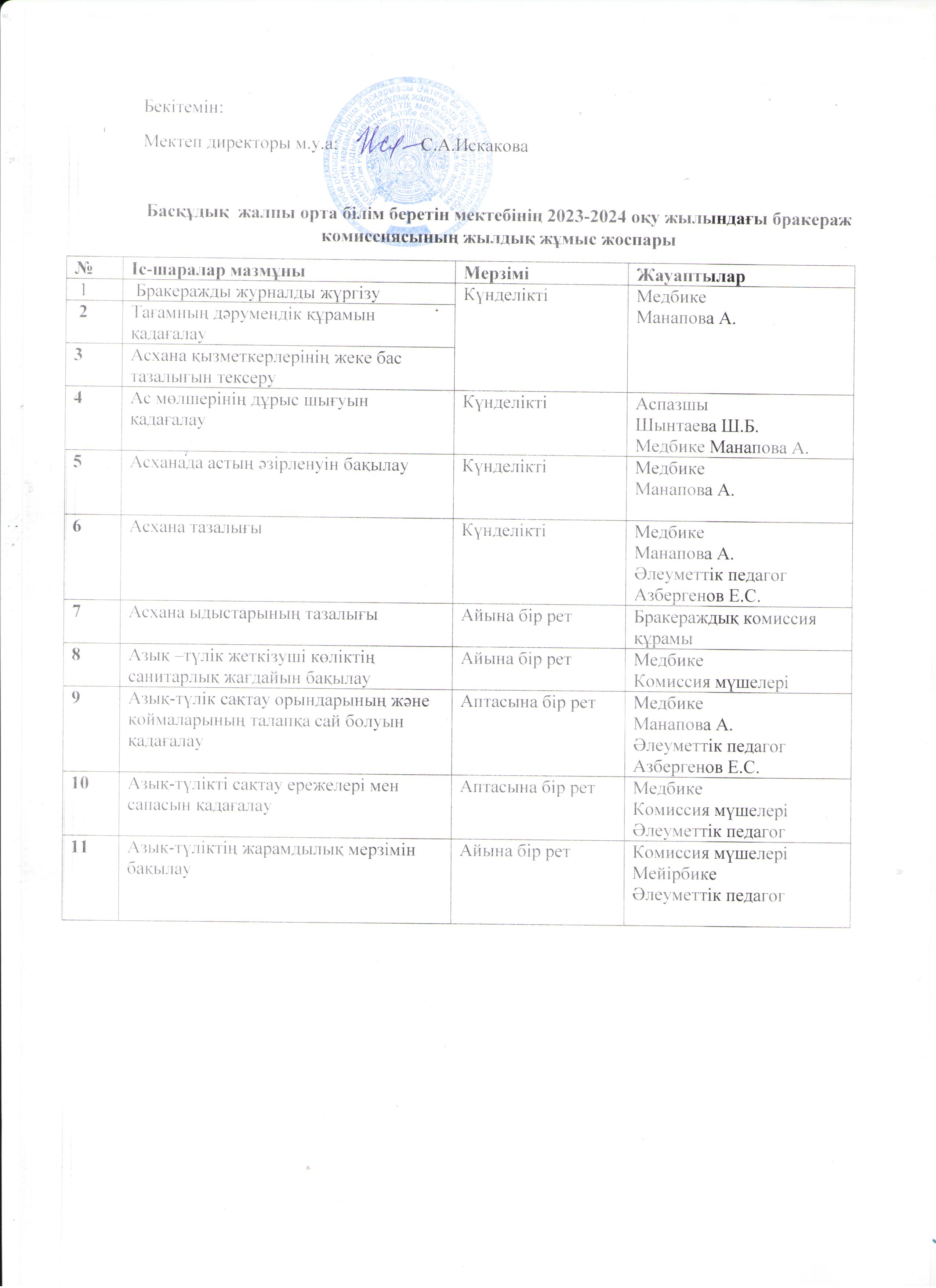 | 10 | Бракераждық комиссияның жұмыс жоспары | |